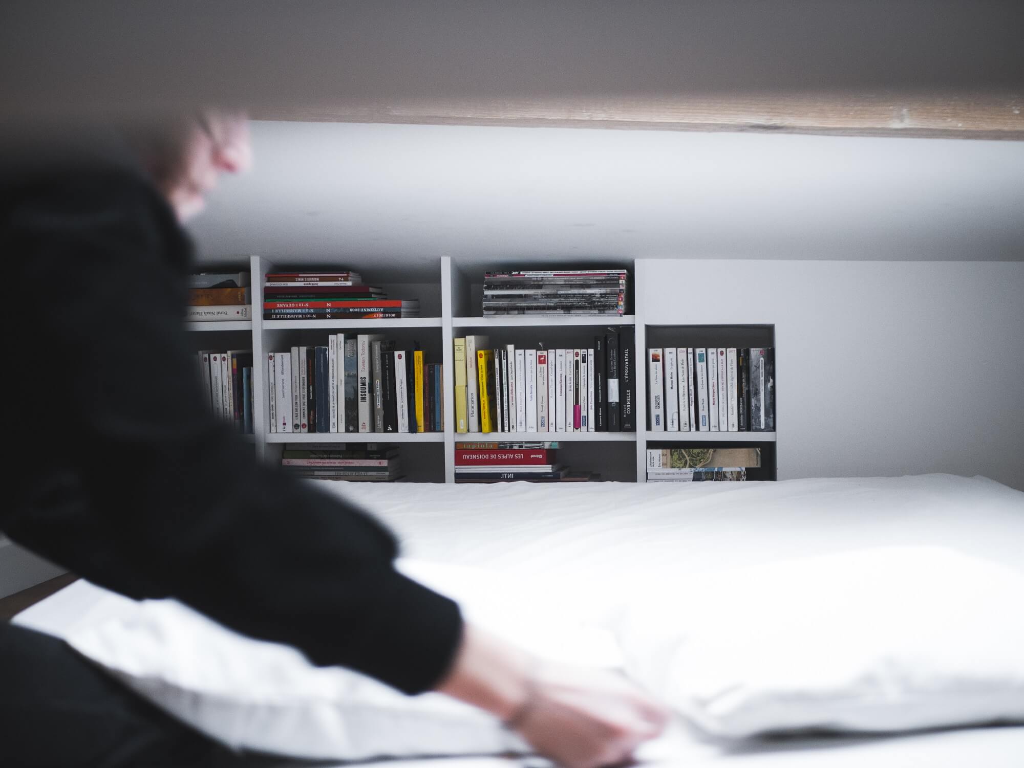 En dessous, un espace de chambre ou bureau sera aménagé selon le souhait de l’usager. Un rideau épais permet de séparer ces espaces, créant également une intimité dans la mezzanine.