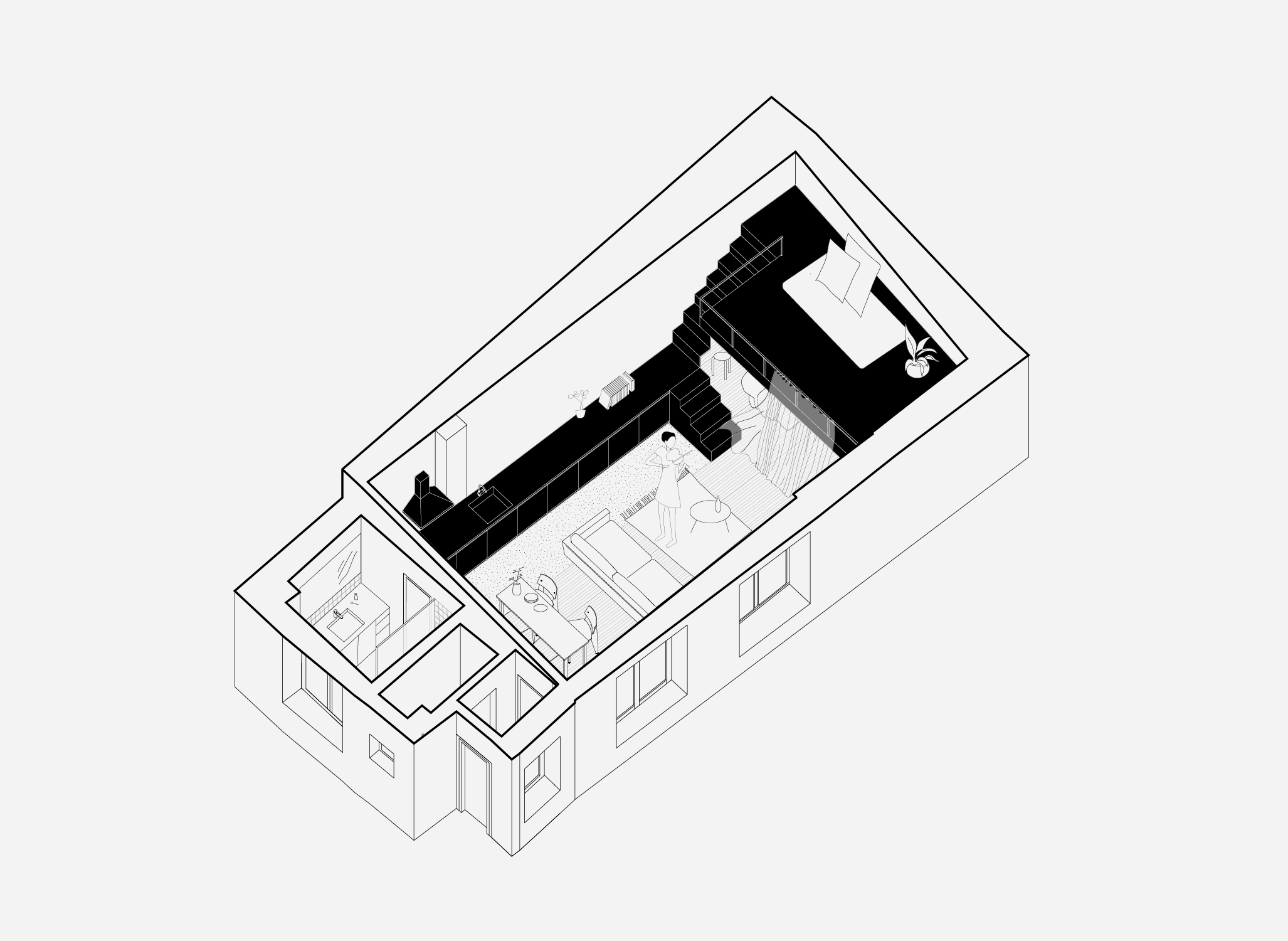 L’idée spatiale directrice est de concentrer l’ensemble des fonctionnalités de l’appartement sur la longueur de la pièce principale, permettant ainsi de dégager le maximum de vide et créer un vrai espace de vie pour accueillir l’ensemble de la famille. Cette ligne nous mène jusqu’à une mezzanine, accessible par un escalier en métal plié.